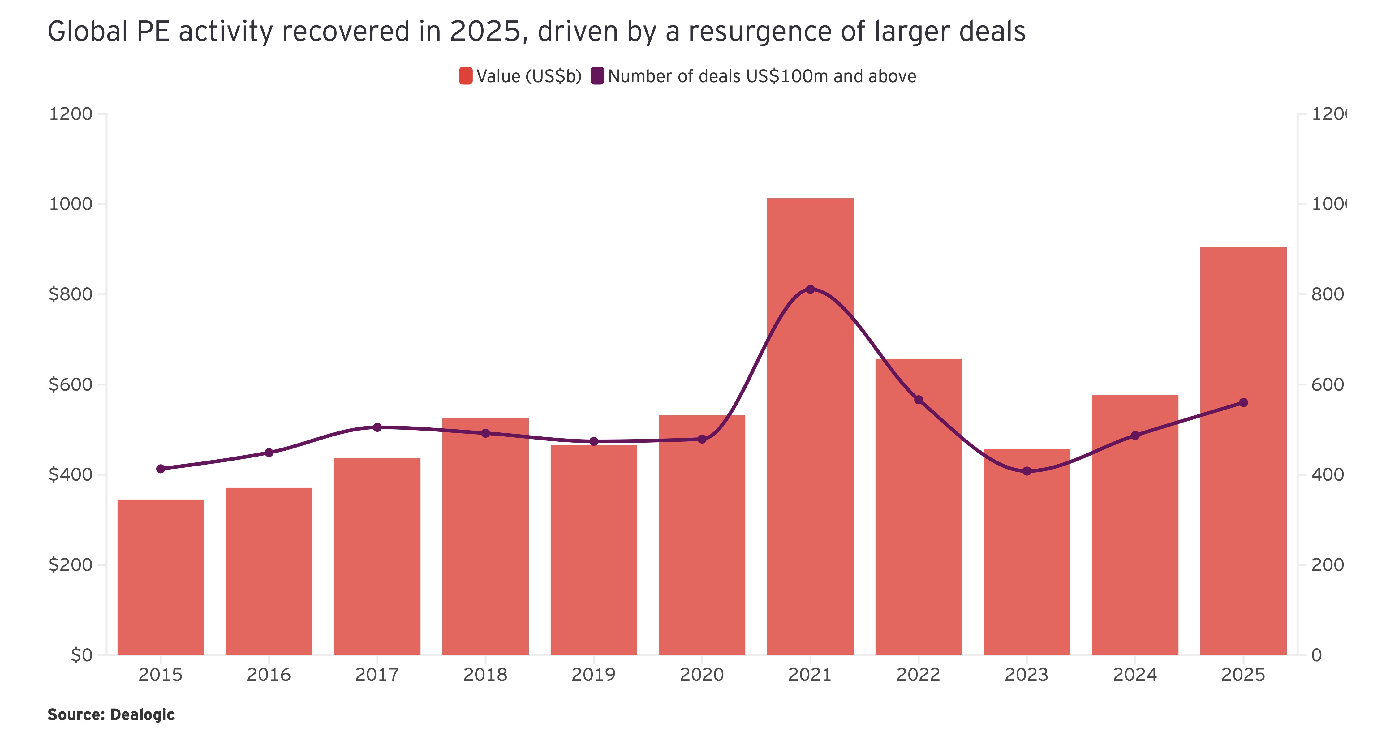 EY hat jüngst seinen aktuellen „EY Private Equity Pulse” vorgelegt. Zunächst ein Blick zurück: Der globale PE-Deal-Wert stieg 2025 im Jahresvergleich um beachtliche 57% auf 905 Mrd. USD – nach nur 577 Mrd. USD im VJ.