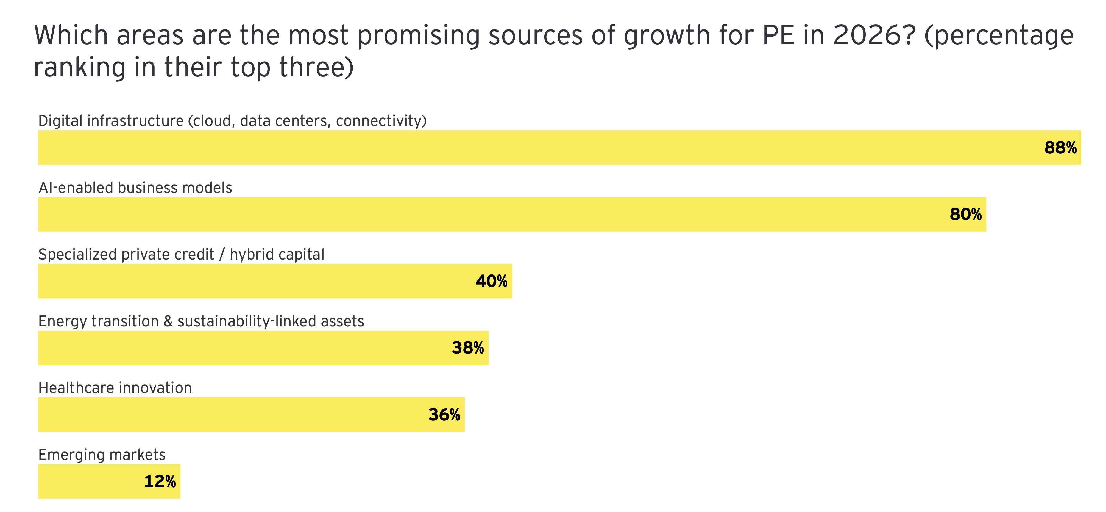 Der Blick nach vorn: Die Prioritäten für 2026 verdichten sich. Kapital konzentriert sich auf wenige, hochskalierbare Wachstumstreiber. Digitale Infrastruktur und KI-getriebene Geschäftsmodelle dominieren laut EY-Umfrage die Agenda. Andere Felder zeigen deutlich weniger Traktion. Der Markt gewinnt damit deutlich an Fokus, aber nur begrenzt an Breite: