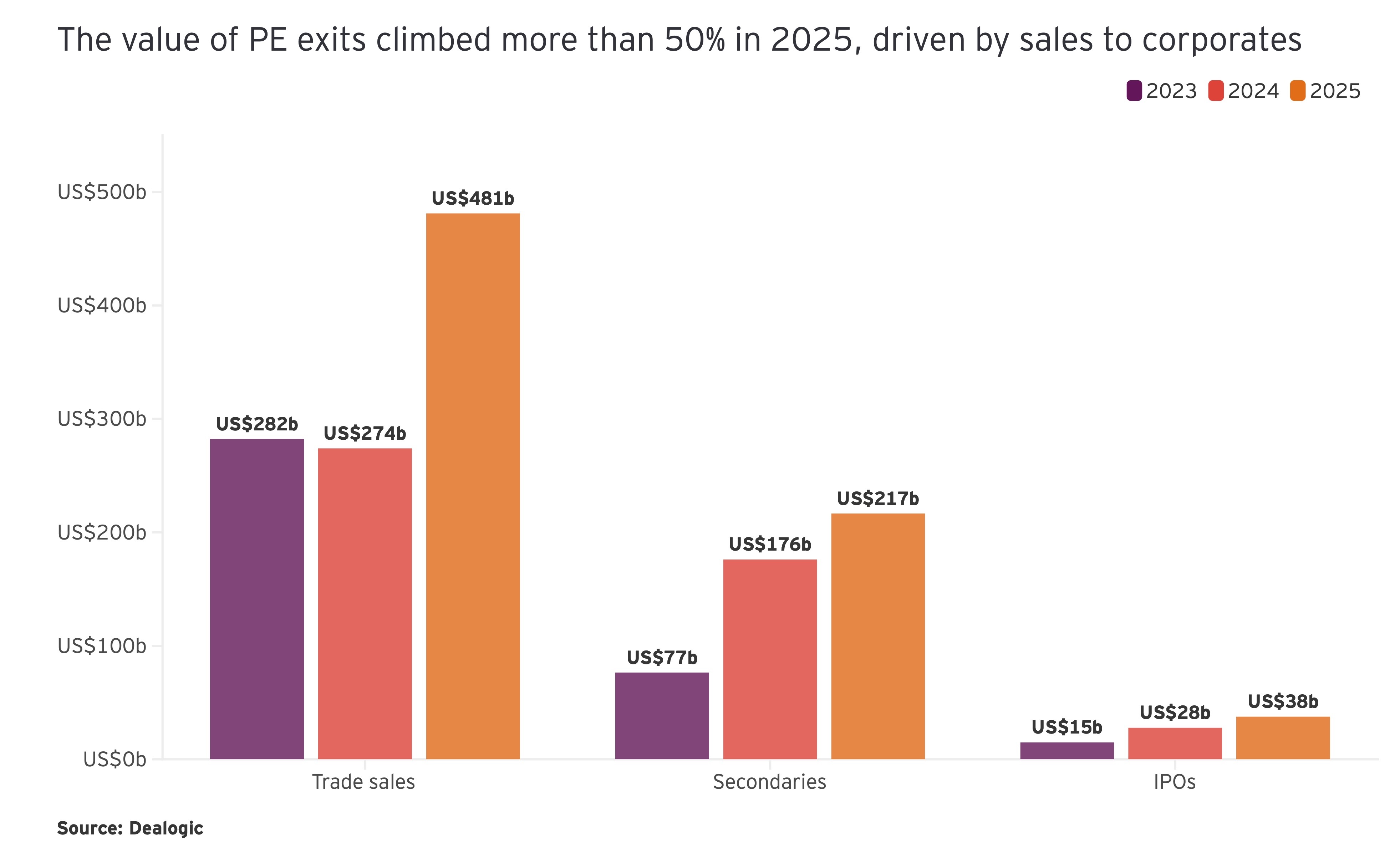 Zum Dauer- und Kernthema Exits: Aggregiert über alle Exit-Kanäle – strategische Käufer, Secondary Buyouts und IPOs – zog die Exit-Aktivität 2025 deutlich an: um mehr als 50% auf rund 736 Mrd. USD (2024 ca. 478 Mrd. USD).